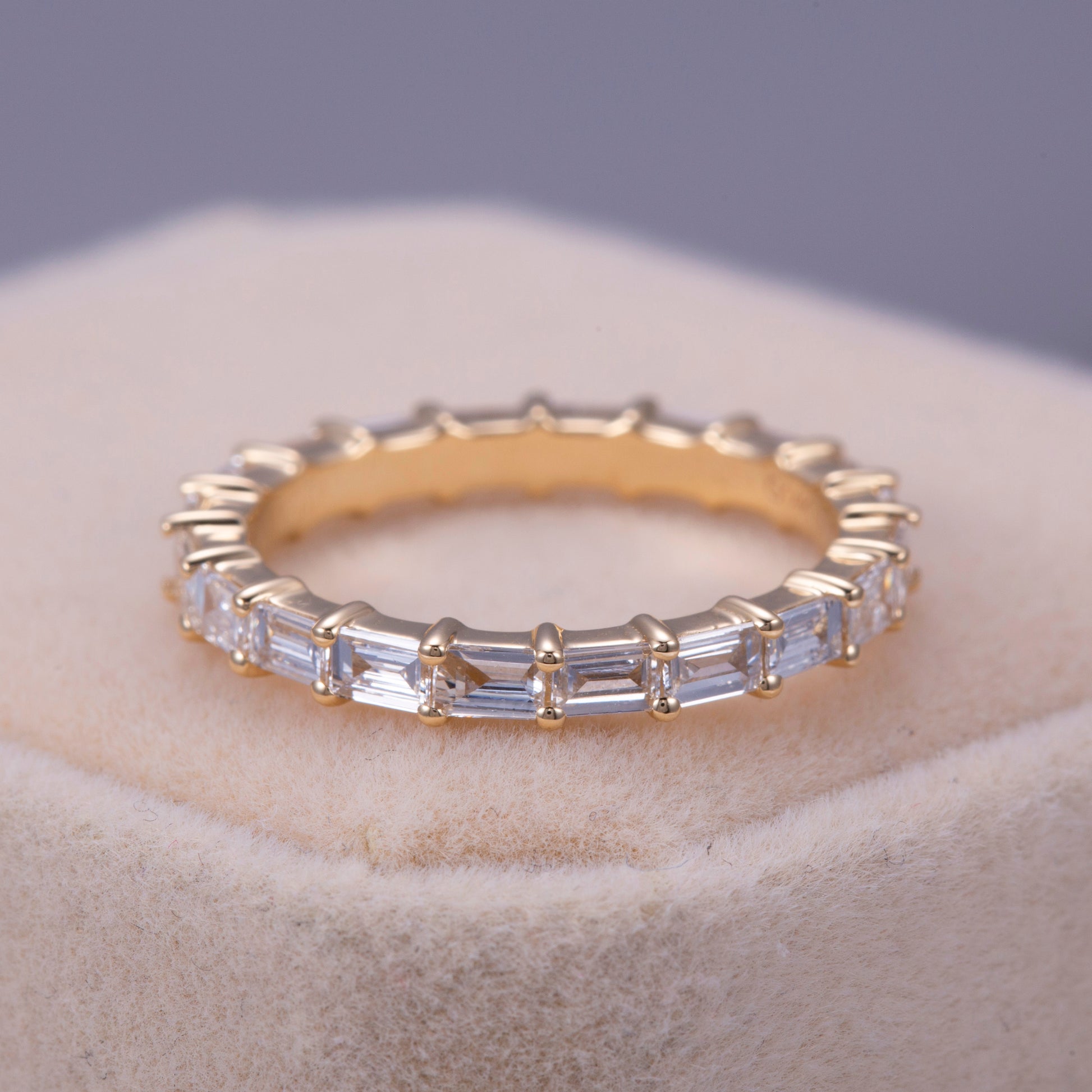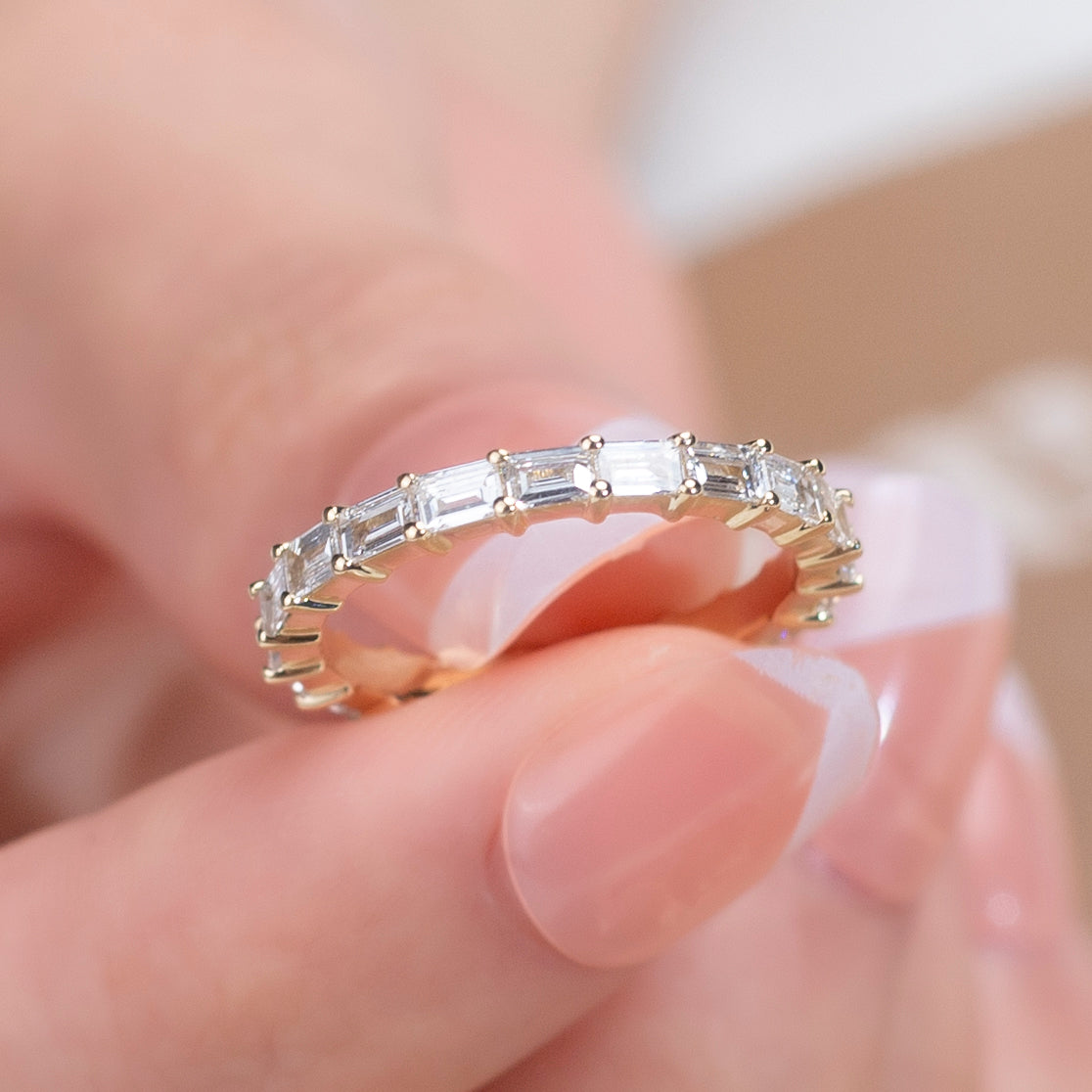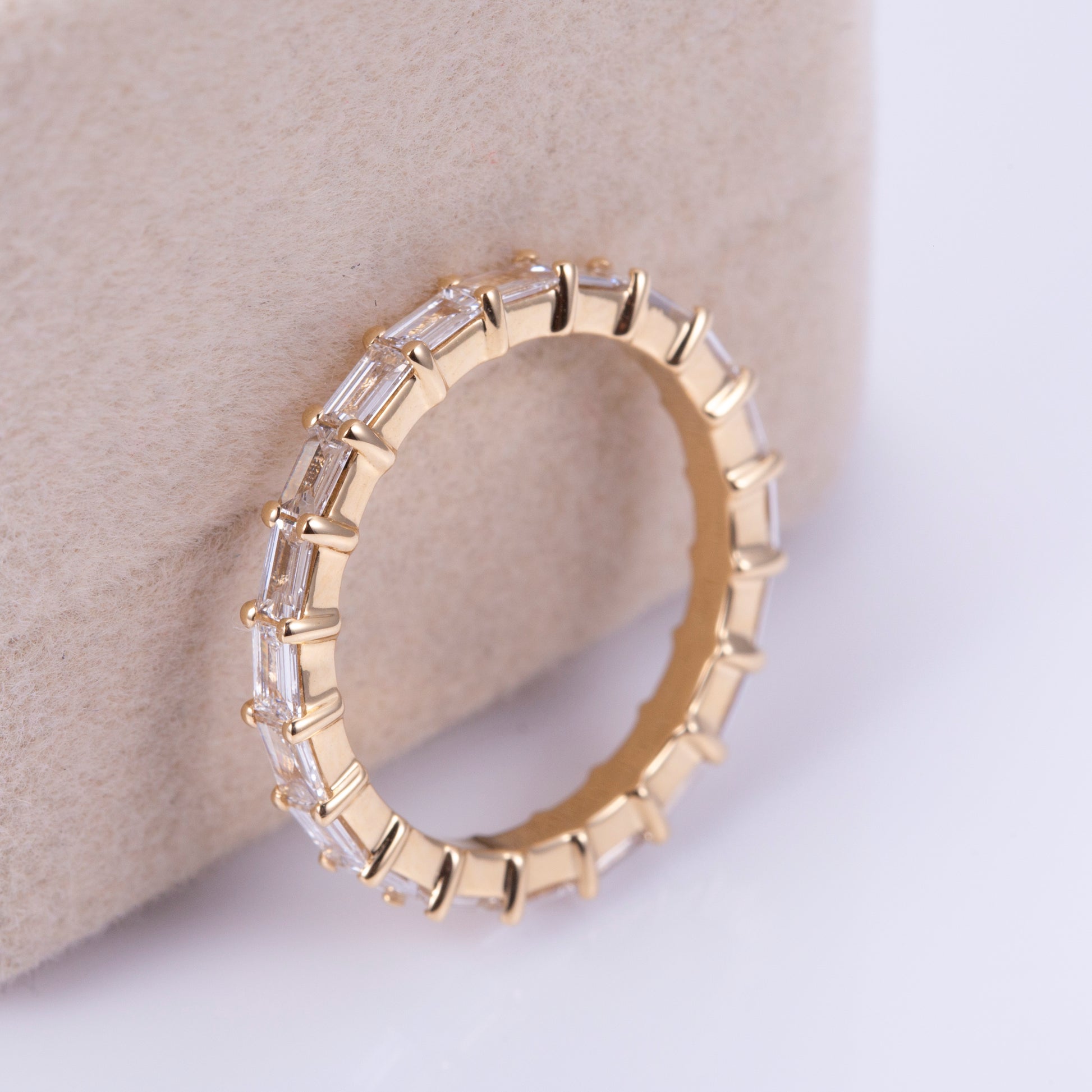 Crafted in 18K gold, the setting was engineered to preserve balance and durability while allowing the diamonds to remain visually uninterrupted. The delicate prong work secures each baguette individually, ensuring structural integrity without compromising elegance or comfort.
