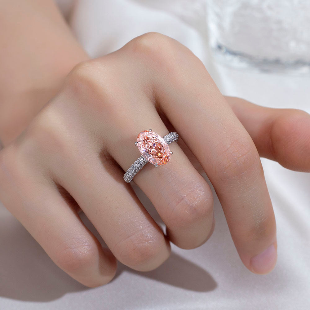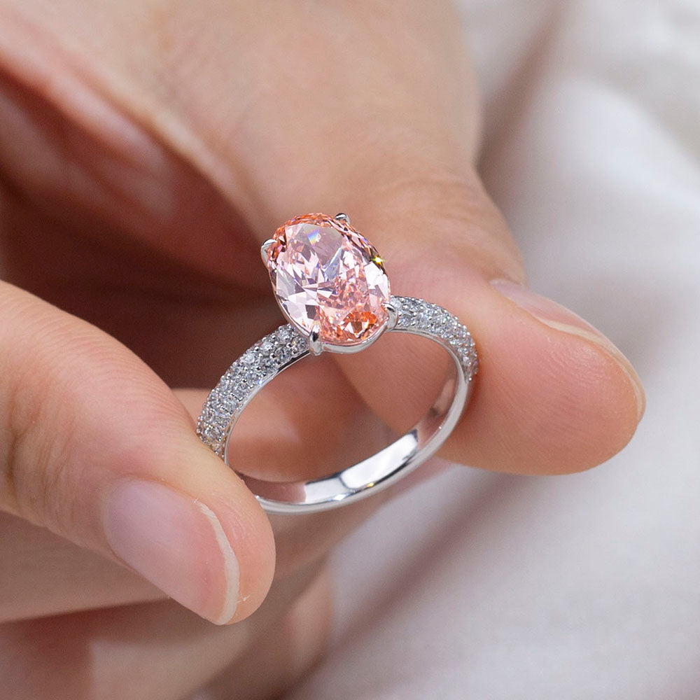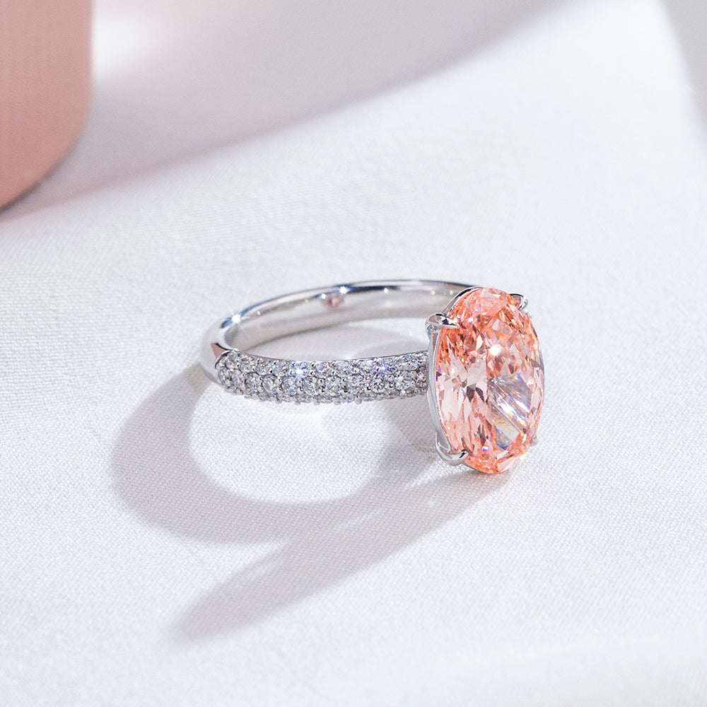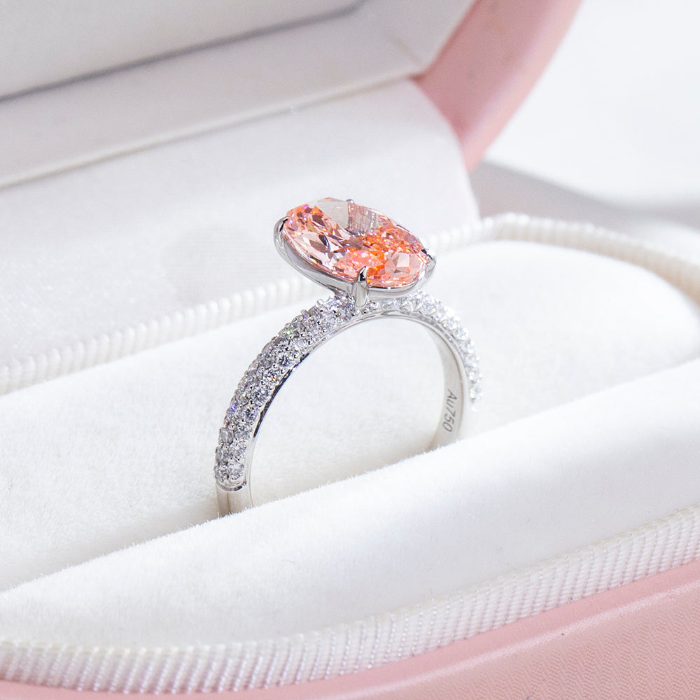 The oval cut was chosen to enhance continuity and elegance, allowing light to travel seamlessly across each facet. Its proportions elongate the silhouette of the hand while amplifying brilliance, transforming the rose hue into a statement of quiet sophistication rather than excess.